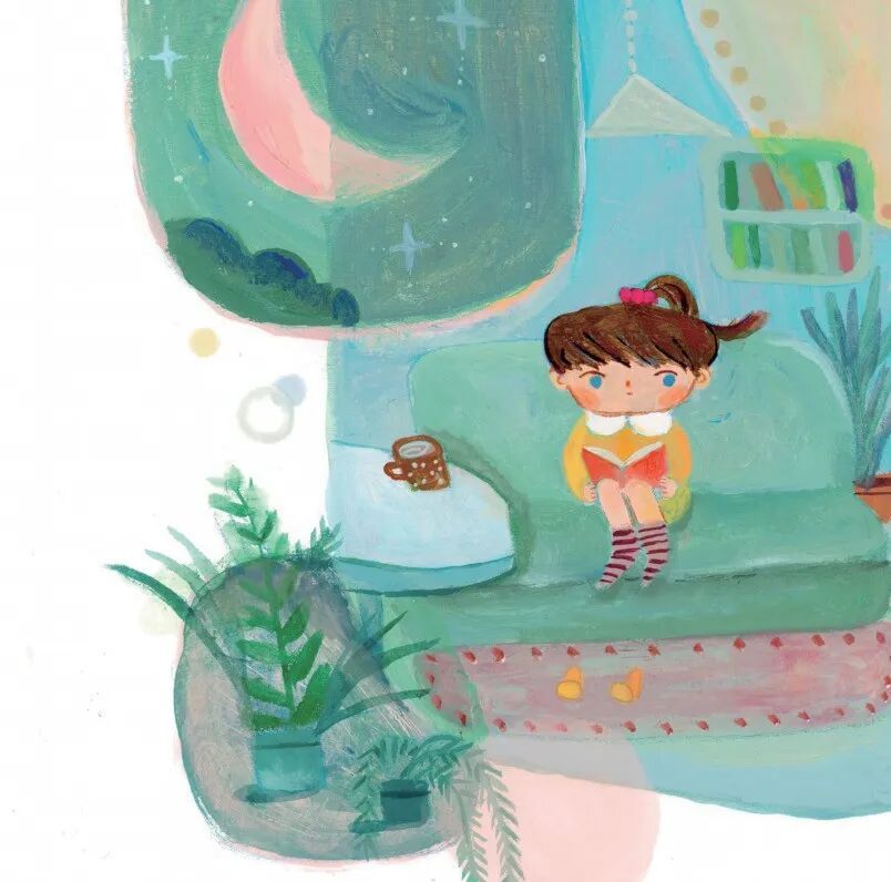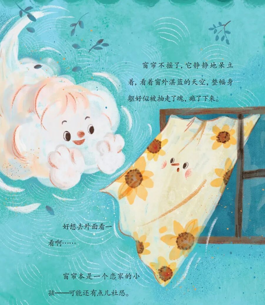 风的故事讲完了,《风与窗帘的约定》今天也要实现了。风叫来了帮手蒲公英,它们的绒毛伞就是窗帘的交通工具。“哗——”窗帘像帆一样鼓起,轻盈地飞走了……