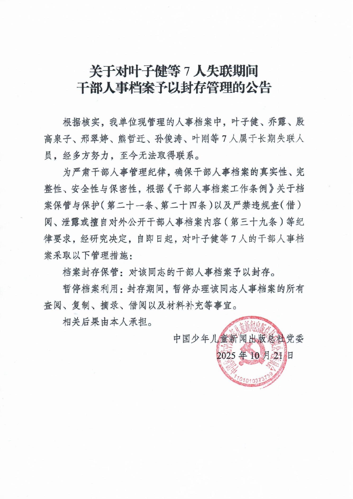 关于对叶子健等7人失联期间干部人事档案进行封存管理的公告