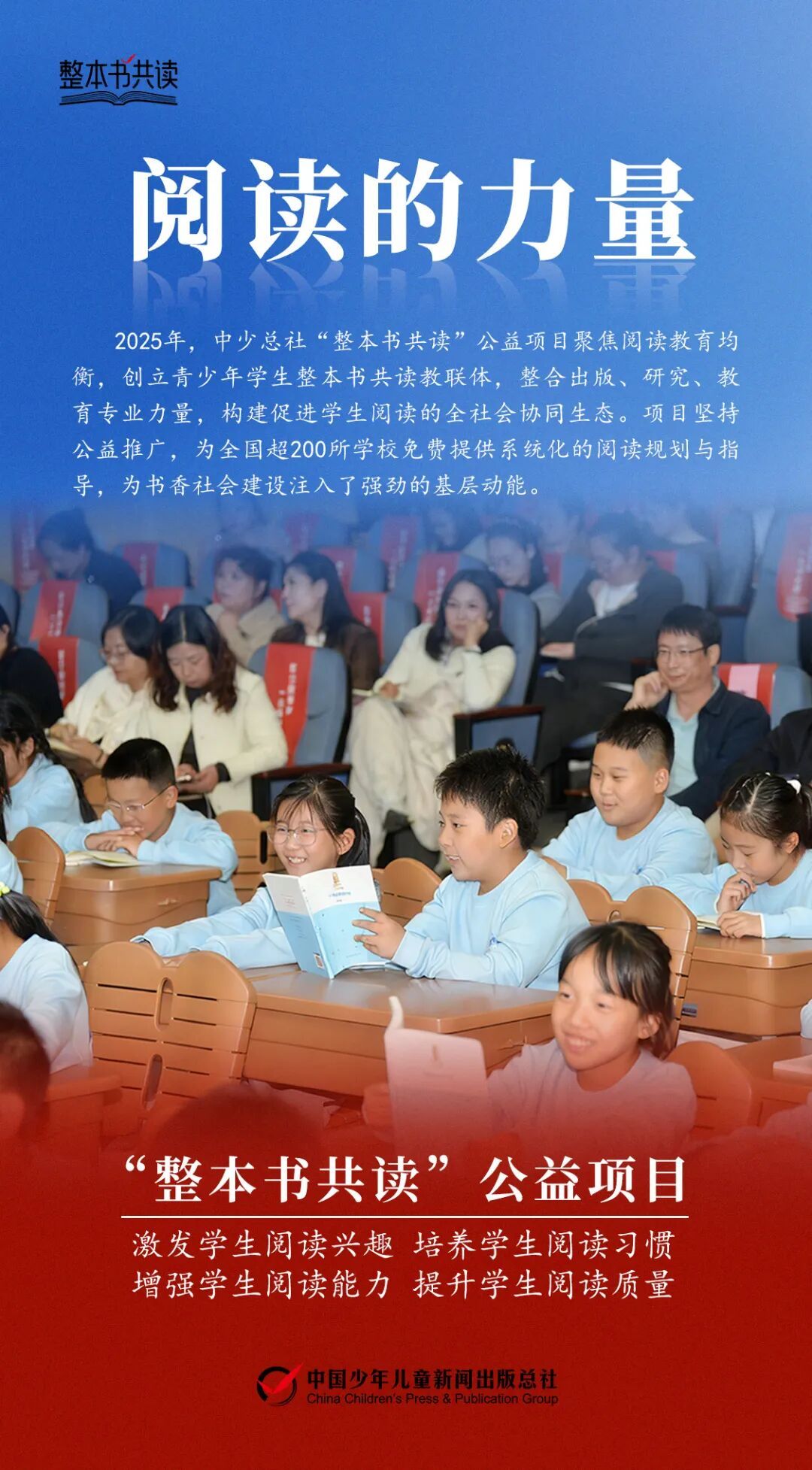 由中国少年儿童新闻出版总社打造的“整本书共读”公益项目,致力于在飞速发展的信息时代,引导带领广大青少年走出碎片化阅读的困境,养成“多读书、好读书、读好书、读整本书”,以及终身阅读的良好习惯。该项目聚焦阅读教育均衡,创立青少年学生整本书共读教联体,整合出版、教育、学术领域专业力量,构建促进学生阅读的全社会协同生态。项目坚持公益推广,已为全国超200所学校免费提供系统化的阅读规划与指导,以经典阅读,为书香社会建设注入了强劲的动能。