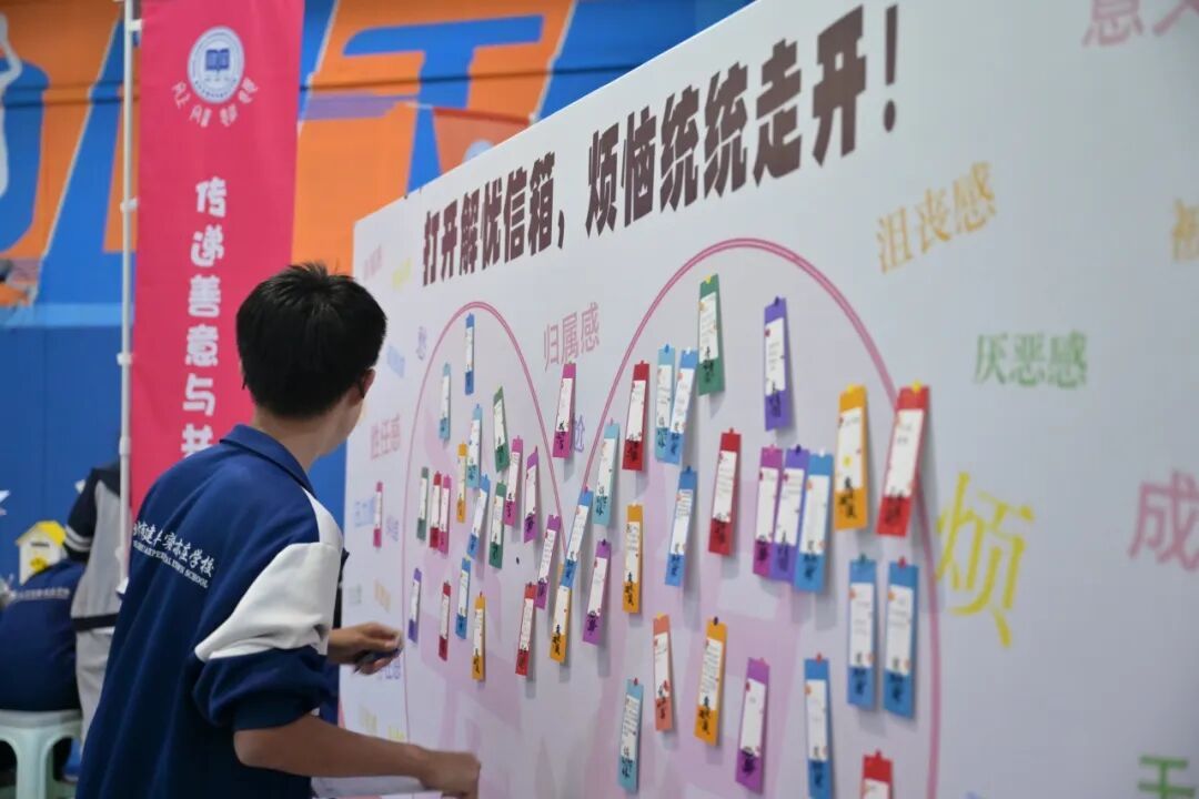 “解忧信箱”前,同学们认真翻阅《情绪词典》,试图在书中找到解忧之道。隔壁摊位,思维接力正在上演:四名同学口述完成“文字传真”,最终版本与原文的差异引发了关于“文学再创造”的热烈讨论。“你和小王子相似,都拥有一颗对世界充满好奇的心!”“你的聪明才智,堪比诸葛孔明!” 不远处,同学们两两一组,学以致“夸”,为彼此拉满情绪价值。