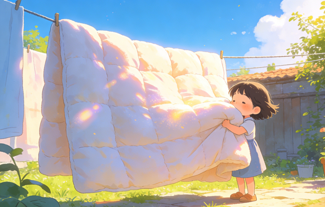 下回收被子时,别忘了先和被子上的“太阳香气”贴贴,蓬松的被子正张开怀抱,仿佛在说:“祝你今晚有个又香又美的梦!