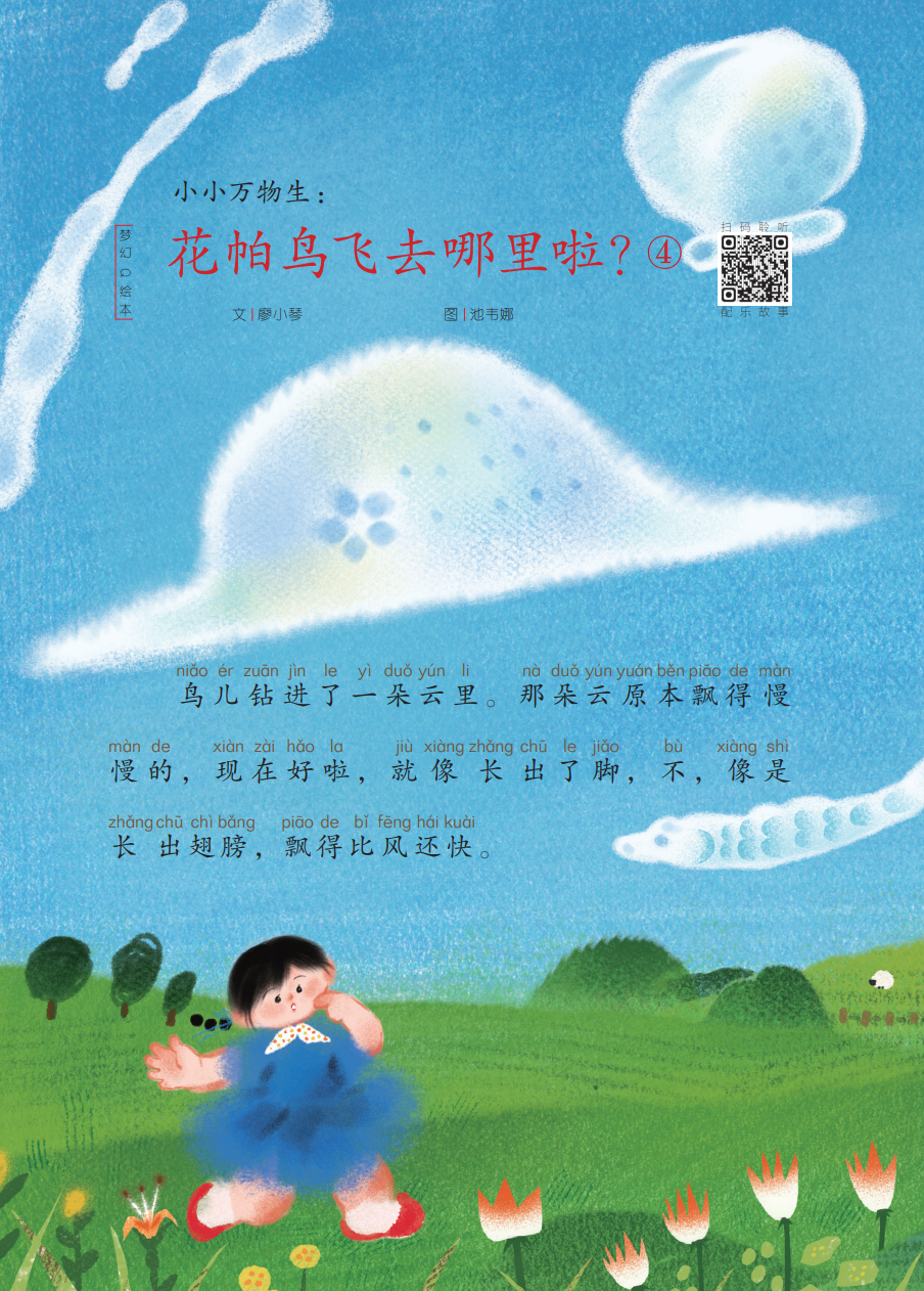 《小小万物生》之《花帕鸟飞去哪里啦④》:花帕鸟钻进云朵里就变了样,飘得比风还快。我骑上风追赶,云停在树上休息。桃树的枝枝丫丫上,哪一朵是鸟儿变的呢?