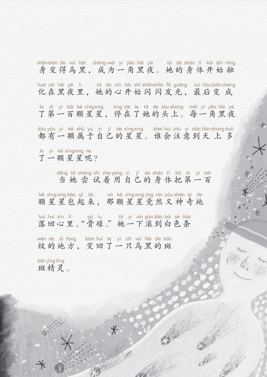 《斑马星球的白天与黑夜》:只有斑斑精灵知道,斑马的身体上是一个有着白天和黑夜的世界,这就是“斑马星球”。斑斑精灵为了保持身体高贵的灰色需要不停赶路,斑斑精灵“夜子”却偏要在条纹处停留,直到她的身体变得透明……