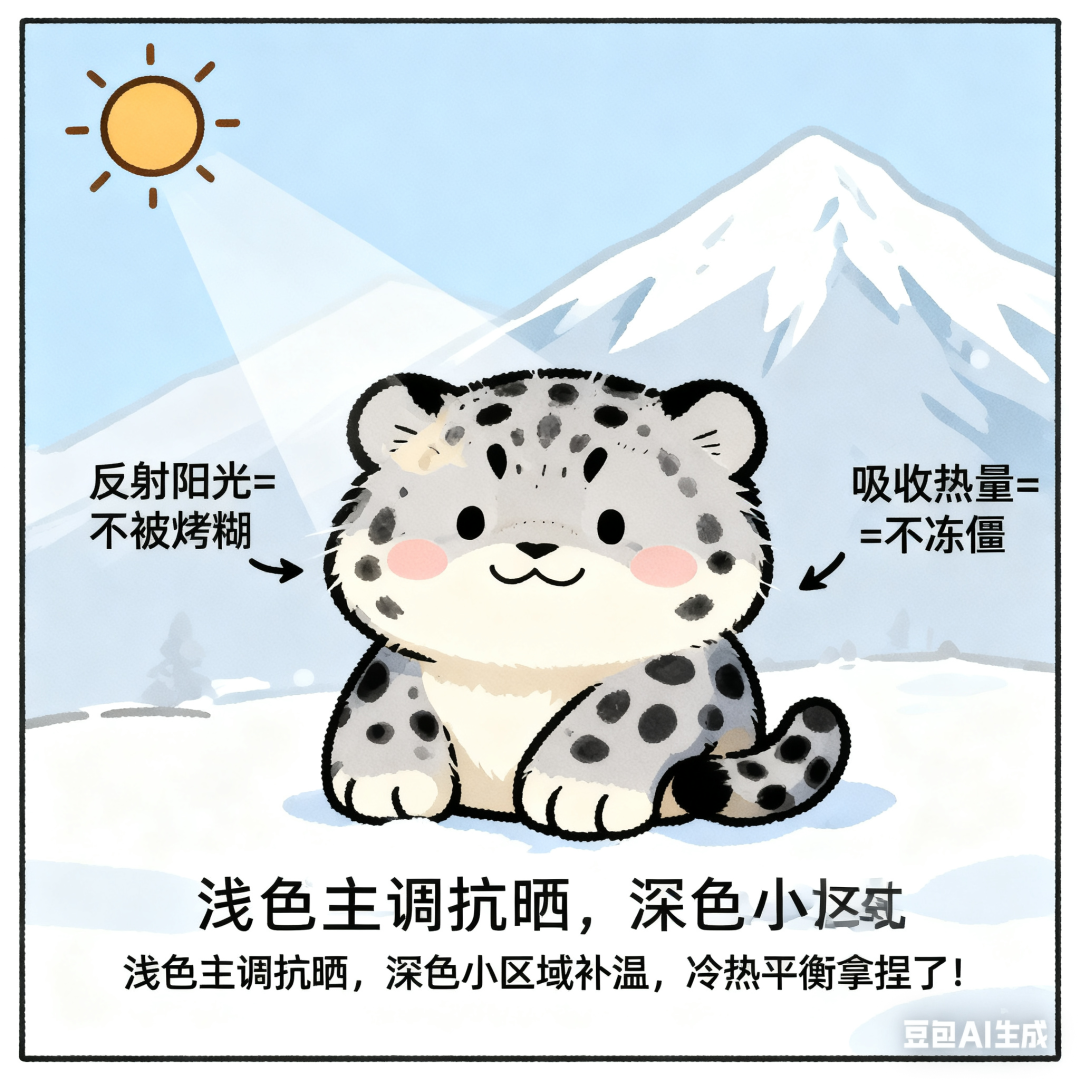 雪豹毛里藏着空心的“髓质层”,就像无数个迷你“柔光箱”,把光线乱反射;还有黑色素细胞当“调色师”,能根据环境微调颜色深浅,让雪豹能匹配28种环境色——雪地的白、岩石的灰、草甸的黄……简直是“环境色板模拟器”。