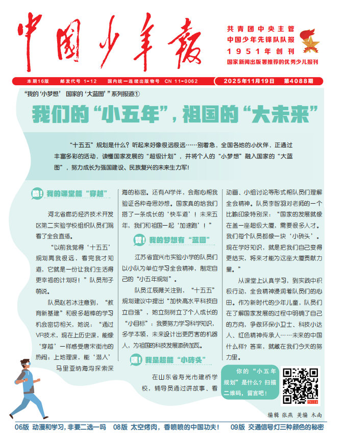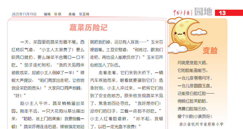 本期又有很多小读者的作品在《中国少年报》闪亮登场~有神奇的蔬菜历险记;有关于月亮变脸的诗歌;还有想象力超丰富的绘画作品哦,快来看这些小作者们大大的能量吧!