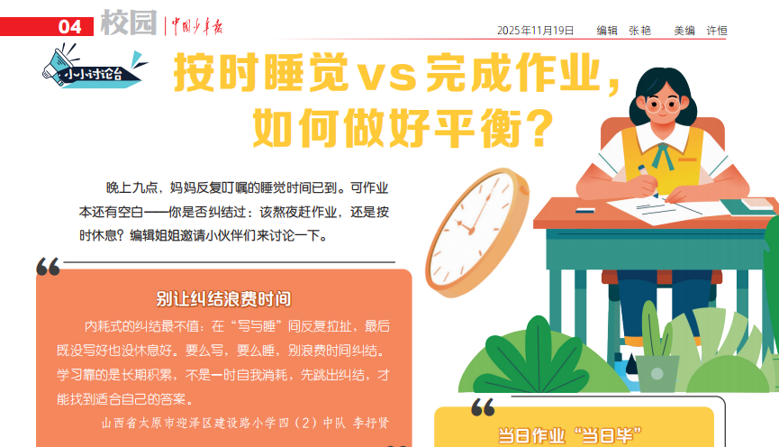 已经晚上九点了,妈妈反复叮嘱的睡觉时间已到。可作业本还有空白——你是否纠结过:该熬夜赶作业,还是按时休息?来本期报纸看看小伙伴们怎么说吧!