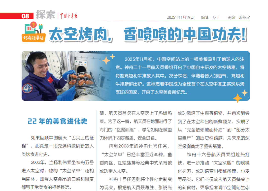 2025年11月初,神舟二十一号航天员乘组在空间站,用中国自主研发的太空烤箱,28分钟烤出喷香鸡翅与牛排,中国成为全球首个实现太空烘烤的国家,开启太空美食新纪元!