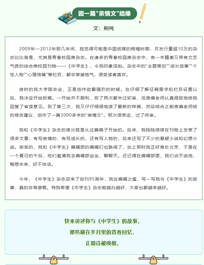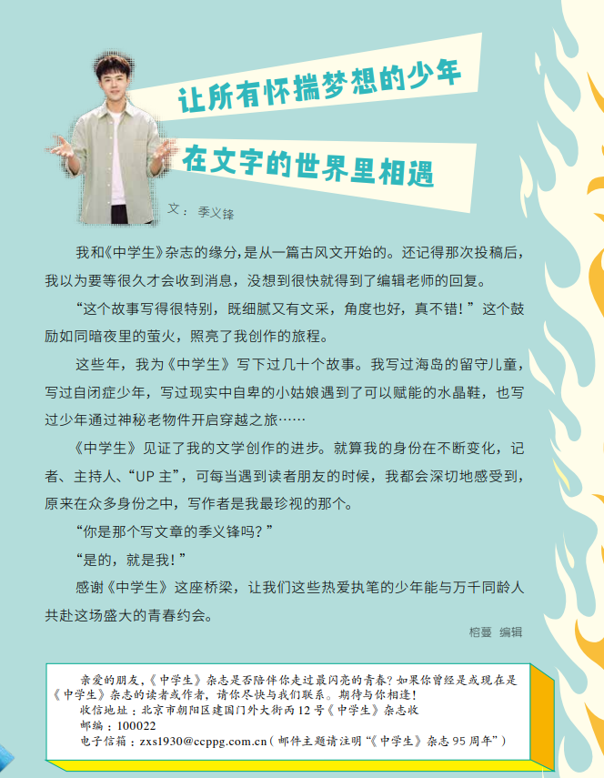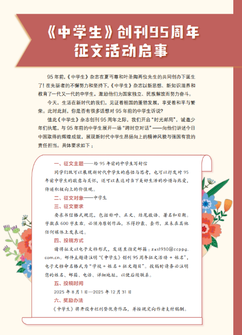 跨越95个春秋,《中学生》的初心从未改变。这不仅仅是《中学生》杂志的生日留念,更是一次与所有新老朋友的温暖相拥。感谢有你,让这段旅程始终充满青春的力量。未来的故事,我们一起谱写。