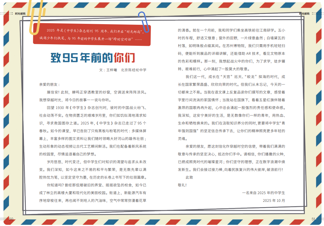 “时光邮局”邀请今天的中学生向95年前的中学生讲述今天的故事。同学们用细腻的笔墨展现了新时代的成就与风貌,传递出积极向上的价值观。