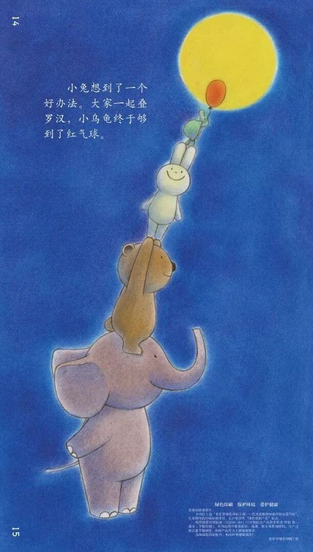 小兔想到了一个好办法。大家一起叠罗汉,小乌龟终于够到了红气球。