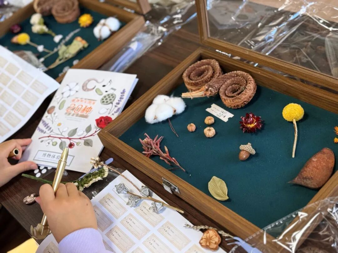 小记者、小读者们要体验的是植物标本的装订步骤!查找植物名称、记录数据,摆放标本、粘贴固定……大家立刻全神贯注地投入到制作中,教室里只剩下纸张摩擦和小声讨论的声音。