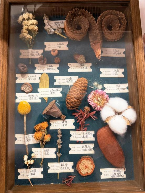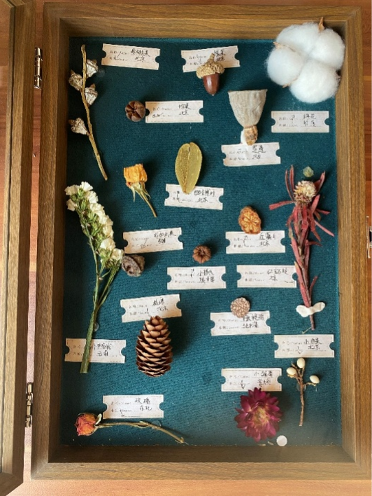 植物标本里有羊角环、薰衣草、玫瑰、松塔等各种各样的植物,我把它们一个个贴到花泥上,写上名字、来源。太有趣了!