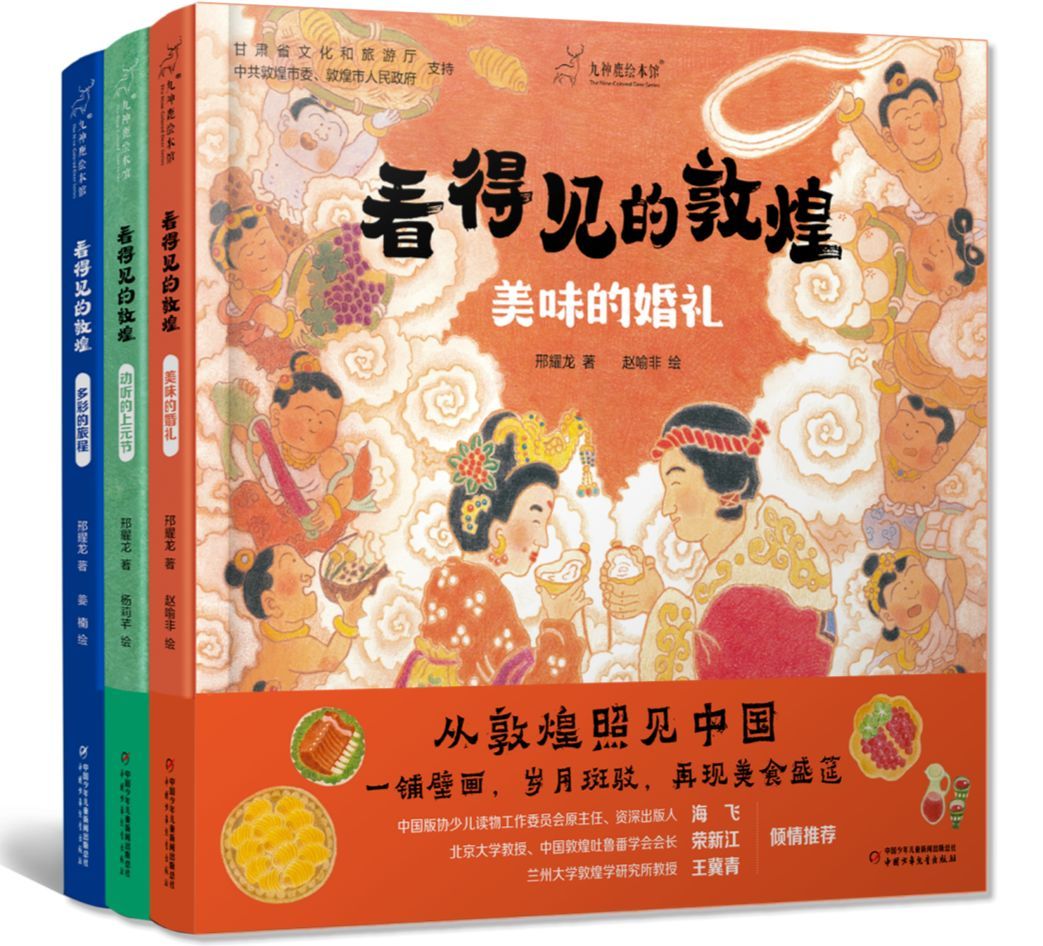 “看得见的敦煌”系列是一套三本的图画书,分别从孩子们尝得到的美食、听得到的乐器和看得到的颜色三个角度出发,从敦煌壁画和真实的历史事迹中汲取灵感,为小读者倾心打磨成一套优质的历史文化启蒙读物。