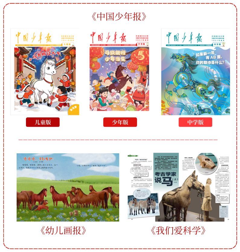 在马年即将到来之际,中少总社旗下报刊已换上“马年新装”,以精心策划的专刊与专栏,融合趣味科普、人文历史、诗词成语、互动游戏和思辨探究等形式,引领孩子们在阅读中解锁“马”的趣味知识、探寻“马”的文化底蕴、感悟“马”所象征的奋进精神。