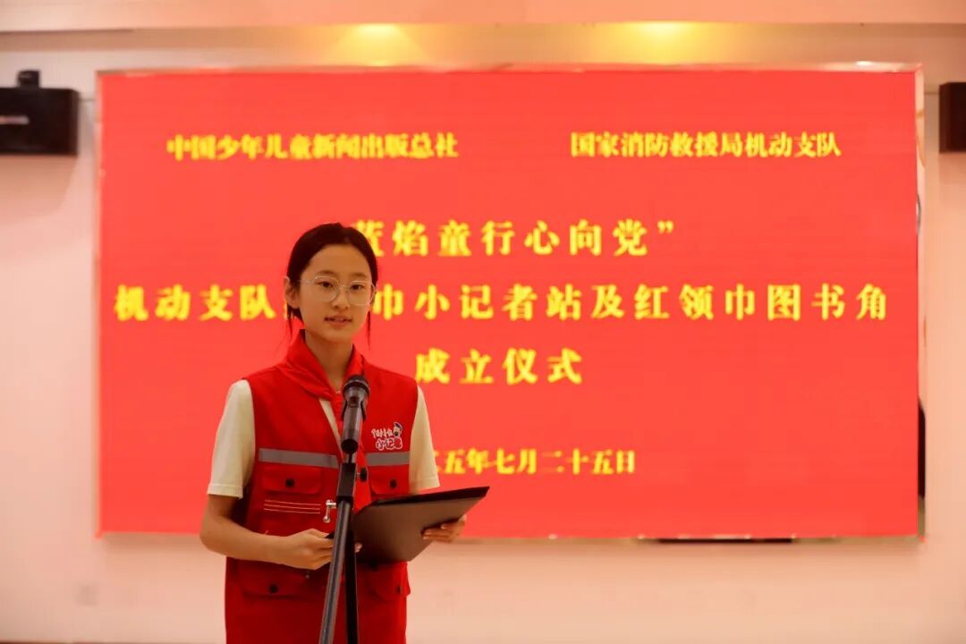 7月25日下午,中国少年儿童新闻出版总社联合国家消防救援局机动支队,在支队香山基地举行《中国少年报》“红领巾小记者站”成立仪式,并进行了“红领巾图书角”捐赠。中国少年儿童新闻出版总社党委常委、副总编辑、《中国少年报》主编蔺玉红,国家消防救援局机动支队谢东辉支队长、王瑜政委出席,首批从支队指战员子女中招募选拔的红领巾小记者代表及他们的父母和指战员代表共同见证这一重要时刻。
