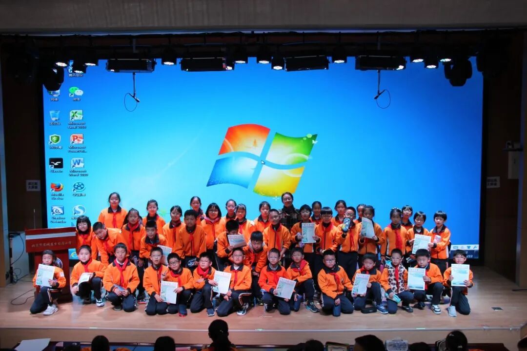 主讲人与现场的少先队员们合影